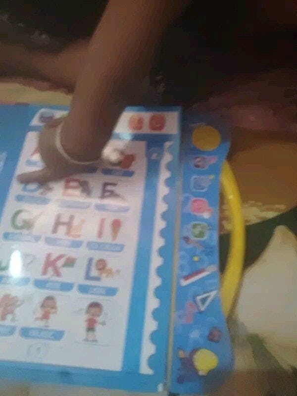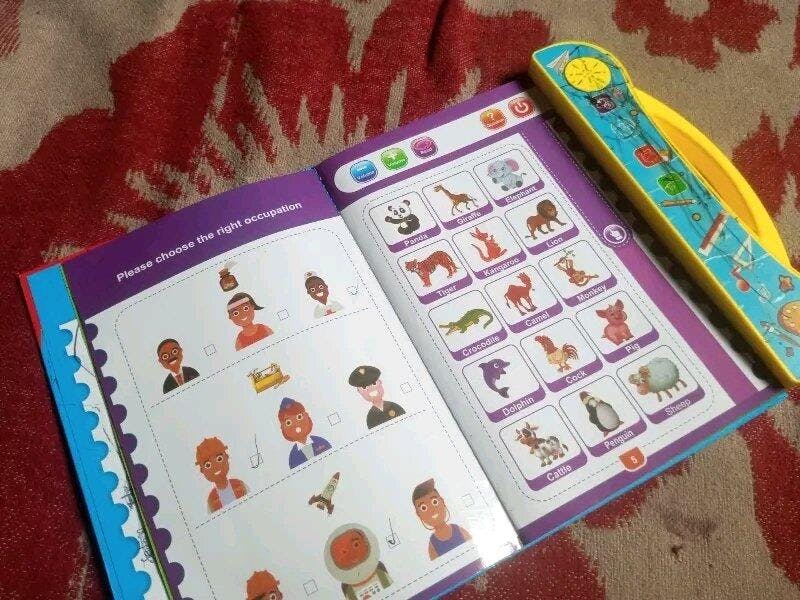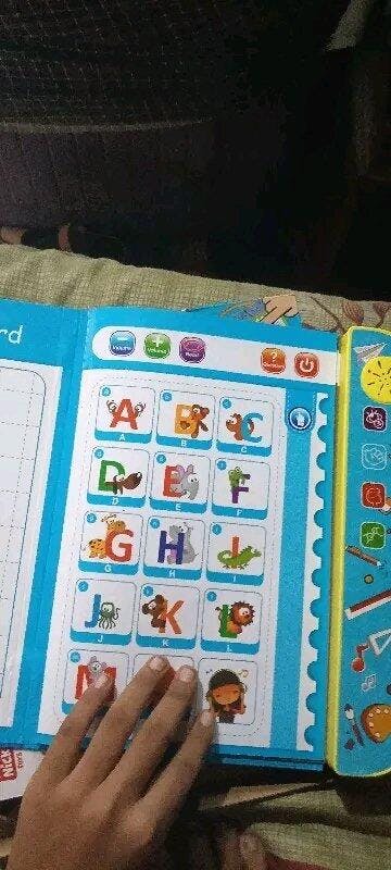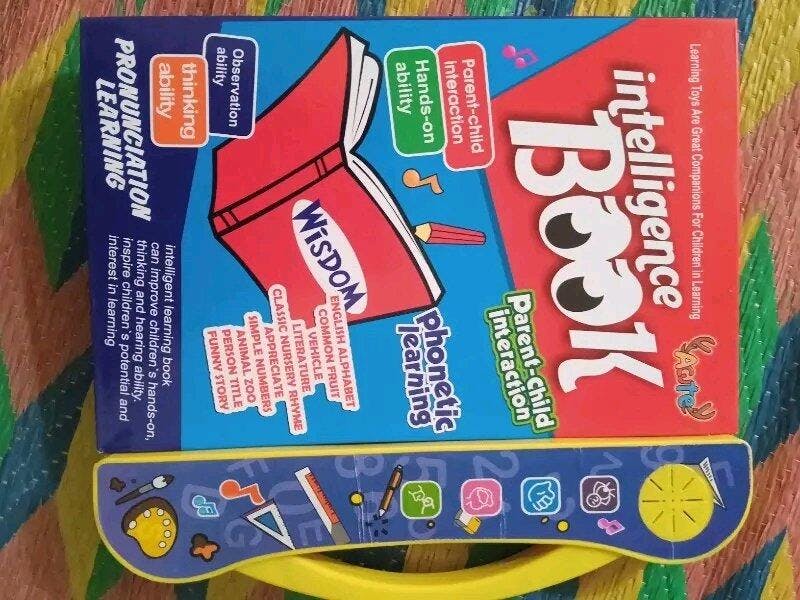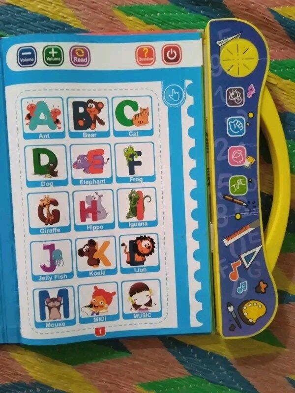 This educational sound book teaches alphabets, numbers, animals, fruits, shapes, phonics, and more through touch-activated audio.